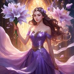 Bestquality,masterpiece,1girl,beautiful_face,eyebrows_visible_through_hair,lily_\(flower\),dress,holding_flower,from_side,sparkling dress,Giant clove flower,Lilac flower,Lilac flower,Giant flowers,flowing skirts,(smoke),Asgard,