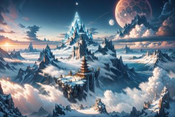 A picture of the landscape showcases towering mountains,  extraordinary peaks,  swirling clouds,  a dazzling sunset,  an ancient pavilion., BJ_Full_Moonmark, tattoo,<lora:EMS-87625-EMS:0.700000>