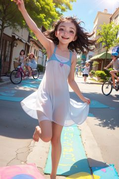 (sweet smile:1.1),(innocent eyes:1.3),(playful laughter:1.1),(carefree spirit:1.3),(sun-kissed hair:1.2),(flowing locks:1.1),(colorful sundress:1.3),(barefoot adventures:1.2),(joyful skipping:1.1),(bicycle rides:1.3),(picking wildflowers:1.2),(ice cream treats:1.1),(sidewalk chalk drawings:1.3),(giggles in the air:1.2),(neighborhood friendships:1.1),(warm summer days:1.3),(gentle breeze:1.2),(innocence preserved:1.1),(childhood memories:1.3),(pure-hearted charm:1.2)