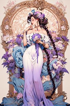 masterpiece,best quality,1girl,8K,HDR,<lora:zhongshimuxia-000013:0.7>,zhongshimuxia,long hair,flower,dress,solo,hair ornament,braid,very long hair,white dress,closed eyes,hair flower,jewelry,earrings,makeup,bare shoulders,purple and pink,art nouveau,ribbon,holding,profile,bouquet,strapless,breasts,hand up,blue flower,english text,off-shoulder dress,lipstick,off shoulder,hair ribbon,strapless dress,bracelet,standing,collarbone,holding bouquet,braided ponytail,holding flower,tassel,eyeshadow,long dress,purple hair,