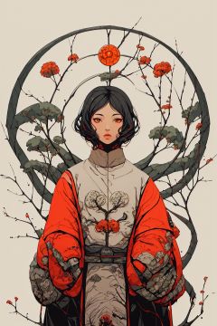 masterpiece,best quality,1girl,8K,HDR,<lora:guochaopingtu4:0.8>,guochaopingtu, Anime, Silver trees, Shimmering plump (Male Mage:1.2) , centered yellow background, surrealism art stylized by Tanya Shatseva