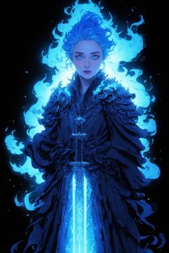 masterpiece,best quality,1girl,8K,HDR,<lora:Xguang-000020:0.6>,Xguang,blue theme,black_background,BLUE FLAME,flame hair,armor,Xguang,weapon,fire,armor,simple_background, Pottery of a Gigantic (Female Lawyer:1.3) , hillside, Bathed in shadows, Sharp and in focus, [ (art by Jules Cheret:1.1) : (Brothers Hildebrandt:0.7) :16], Cozy, Tinycore, Depth of field 270mm, in the style of Star Wars, UHD