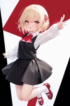 1girl, rumia, blonde hair, solo, white background, red eyes, red footwear, simple background, ascot, short hair, ribbon, open mouth, hair ribbon, smile, long sleeves, shirt, looking at viewer, red ascot, white socks, white shirt, red ribbon, shoes, socks, frills, bangs, outstretched arms, hair between eyes, skirt, :d, dress, vest, mary janes, black dress, black skirt, collared shirt, black vest, blush
