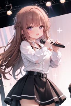1girl, solo, microphone, smile, skirt, blush, brown eyes, long hair, open mouth, looking at viewer, brown hair, long sleeves, :d, shirt, bangs, belt, breasts, pink shirt, outstretched arm, music, black belt, medium breasts, holding microphone, singing