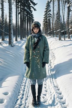 ((masterpiece)), ((best quality)), 8k, high detailed, ultra-detailed,(1girl),full-body, in winter, (snowy ground), (outdoor), (cold), (white), (freezing), (winter clothing), (boots), (coat), (hat), (gloves), (scarf), (ice), (snowflakes), (blue sky), (sunlight), (tree branches), (winter scenery).,lvlvlv,1girl,moyou