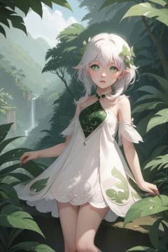 nahida, detailed illustration, kusanali,kid, white hair,white dress, green eyes,hair ornament, blush, full body, scenery, jungle,32k