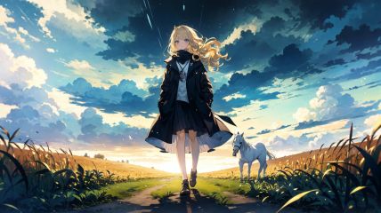 (1girl, solo), (white horse), blonde hair,long hair,wavy gair,cornfield, tree, distant storms, dark clouds, tornado,(mid shot, panorama,depth of field),full body,backlight