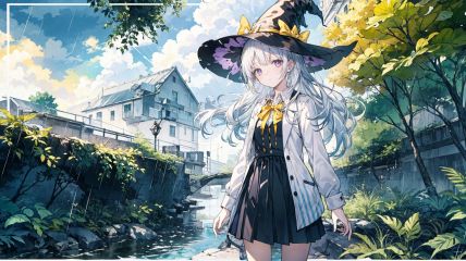 1girl, ahoge, (standing,dark clouds,overcast sky,panorama,tree,stone road,river,rainy),dynamic pose, elaina (majo no tabitabi), smile, purple eyes, solo, long hair, bangs, floating leaves,(outdoors),:o, shirt, skirt, bow, white hair, blush, long sleeves,vertical stripes, striped, collared shirt, potted plant, cover image, vertical-striped dress, yellow ribbon,open clothes,witch hat,mid shot,(silver hair),backlight