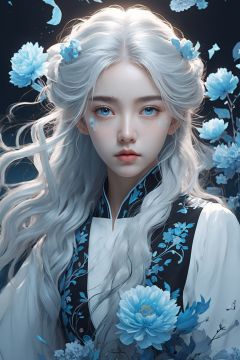 (official art, unity 8k wallpaper, ultra detailed, High quality, best quality), (blue black), flat color, limited palette, low contrast, (1girl:1.5), solo, (gloomy), (blue pigment:1.33), (expressionless eyes:1.3), long hair, messy hair, china dress, white hair, (glass:1.2), (reflection:1.2), (fantasy:1.2), (kaleidoscope:1.3), flower, from side, polyprism