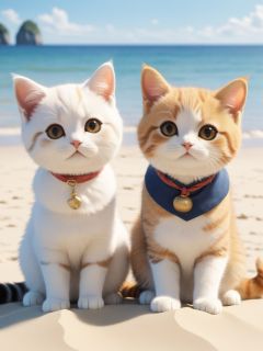 cute cats on beach, in the style of balanced symmetry, spontaneous gestures, movie still, shige's visual aesthetic style, group zero, tondo, creative commons attribution,cute animal,3D