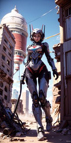 1mechanical_girl_with_kidou_keisatsu_patlabor_body , wearing_intricate_bioluminescent_mechanical_cyborg_armor_made_out_of ((white_beige_old_plastic)) , ((ultra realistic details)), detailed_face, global_illumination, shadows, octane_render, 8k, ultra_sharp, metal, ornaments_detailed, cold_colors, egypician_detail, highly_intricate_details, realistic_light, trending_on_cgsociety, glowing_eyes, look down on someone, ((from below)), lifted by self, looking at viewer, neon_details, machanical_limbs, blood_vessels_connected_to_tubes, ((lot_wires_and_cables_connecting_to_head_and_body)), killing_machine, extremely_sexy, lustful, ((medium breasts)), slutty , official wallpaper, NSFW, , In the style of Neon Genesis Evangelion, you find yourself standing on a desolate, post - apocalyptic wasteland, as the distant ruins of a massive city loom on the horizon. The sky is filled with ominous clouds, as a massive creature towers in the distance,Robot,mecha,Hourglass body shape,Roblit