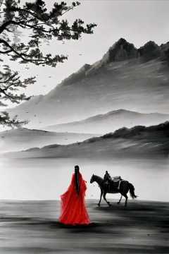1girl,tree,<lora:ink_xiakexing_v1_512:0.8>,red dress,holding a horse,