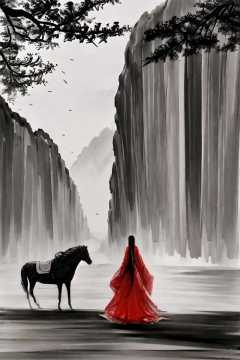 1girl,tree,<lora:ink_xiakexing_v2_128:0.8>,red dress,holding a horse,