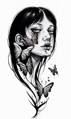 a girl has two face with butterflies on her nose and a butterfly in her mouth,,draktattoo,white background <lora:diablo-1119:1>