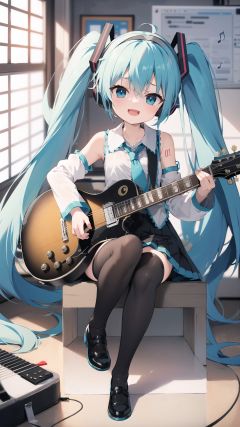 1girl, instrument, solo, long hair, hatsune miku, skirt, thighhighs, twintails, shirt, very long hair, detached sleeves, sitting, neck ribbon, black skirt, headphones, white shirt, ribbon, high heels, playing instrument, sleeveless shirt, aqua ribbon, pleated skirt, miniskirt, guitar, black thighhighs, holding, music, full body, sleeveless, holding instrument, aqua hair, see-through, black footwear, petals, layered sleeves, see-through sleeves, zettai ryouiki, open mouth, bare shoulders, hair between eyes, stool, black sleeves, looking at viewer, long sleeves, aqua eyes, hair ornament, nail polish, collared shirt, white sleeves, electric guitar, see-through legwear, smile
