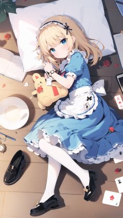 1girl,blonde hair,long hair,alice (alice in wonderland),stuffed toy,blue eyes,watch,card,stuffed animal,pantyhose,apron,pocket watch,solo,dress,flower,book,cup,rose,shoes,lying,black footwear,playing card,teacup,on side,key,red flower,short sleeves,petals,stuffed bunny,blue dress,white apron,looking at viewer,hairband,bow,pillow,food,puffy sleeves,checkered floor,hat,cookie,red rose,frills,mary janes,puffy short sleeves,top hat,saucer,bangs,