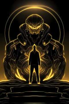 a man standing in front of a projection of immortal,halo,<lora:eastern_mythology_v1_512_preview:0.4>,