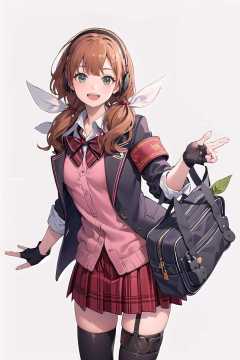 original outfit, 1girl, solo, skirt, gloves, fingerless gloves, bag, smile, jacket, white background, red skirt, open mouth, simple background, black gloves, looking at viewer, armband, cardigan, plaid skirt, school uniform, :d, pleated skirt, plaid, bowtie <lora:howatype89-pynoiseloha:1>