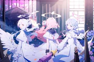 (masterpiece:1.2),best quality,PIXIV,blue archive,multiple girls, mika (blue archive), halo, weapon, pink hair, gun, wings, long hair, single side bun, feathered wings, hair ornament, hair bun, low wings, flower, hair flower, white wings, blurry background, capelet, 3girls, school uniform, scrunchie, dress, blurry, submachine gun, white dress, black scrunchie, 2girls, from behind, holding weapon, yellow eyes, holding gun, smile, hair scrunchie, very long hair, sailor collar, twintails, looking at viewer, open mouth, holding, one side up<lora:blue archive-000018:1>,