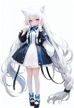 1girl, white_gloves, braid, full_body, gloves, long_hair, official_alternate_costume, pointy_ears, simple_background, solo, standing, very_long_hair, white_background, white hair, blue eyes, paw claw pose, open_mouth