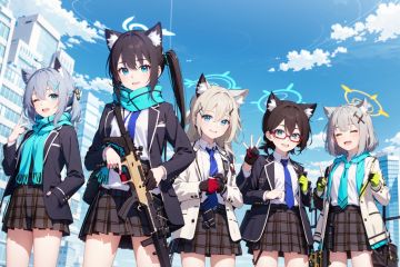 -shiroko (blue archive), halo, weapon, multiple girls, animal ears, nonomi (blue archive), gun, sig sauer, 4girls, jacket, long hair, skirt, assault rifle, gloves, school uniform, glasses, id card, rifle, plaid skirt, grey hair, twintails, scarf, smile, outdoors, necktie, closed eyes, black hair, cat ears, shirt, short hair, hair ornament, extra ears, holding, shotgun, animal ear fluff, pleated skirt, blazer, sky, cloud, open jacket, open mouth, white shirt, red eyes, looking at viewer, plaid, ahoge, red-framed eyewear, blue eyes, building, shorts, mismatched pupils, hoshino (blue archive), brown hair, bangs, cross hair ornament, holding weapon, very long hair, long sleeves, open clothes, holding gun, brown eyes, fingerless gloves, collared shirt, blue scarf, black gloves, green gloves, city, breasts,blue archive,<lora:blue archive-000018:0.8>,