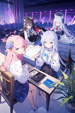 -multiple girls, halo, long hair, azusa (blue archive), lying, 5girls, hair ornament, blue eyes, hair flower, flower, black hair, dress, on back, shiroko (blue archive), purple eyes, animal ears, plant, aris (blue archive), white hair, potted plant, hina (blue archive), skirt, closed eyes, bangs, hair between eyes, grey hair, official alternate costume, alternate costume, holding, red hair, pink hair, wings, horns, looking at viewer, shirt,blue archive,<lora:blue archive-000018:0.8>,