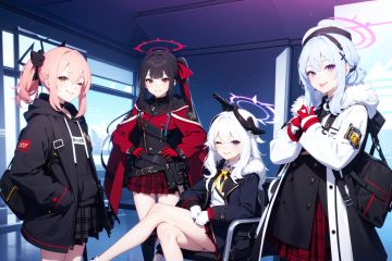 (masterpiece:1.2),best quality,PIXIV,blue archive,mutsuki (blue archive),kayoko (blue archive),aru (blue archive),multiple girls,horns,skirt,weapon,halo,gun,4girls,black hair,white hair,multicolored hair,hood,hair ornament,long hair,white gloves,shirt,side ponytail,hat,gloves,white shirt,bag,one eye closed,red skirt,two-tone hair,long sleeves,hoodie,red eyes,hairclip,bangs,sitting,neck ribbon,looking at viewer,crossed legs,high-waist skirt,pink hair,coat,fur trim,garrison cap,ribbon,ponytail,jacket,smile,black skirt,plaid,rifle,plaid skirt,tongue out,purple eyes,red ribbon,chair,black hoodie,tongue,backpack,demon horns,closed mouth,hood down,sniper rifle,hands in pockets,yellow eyes,breasts,piercing,sidelocks,red hair,black headwear,holding,coat on shoulders,holding weapon,<lora:blue archive-000018:0.8>,