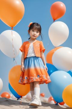 A fashionable and cute6-year-old Chinese girl, mainly in orange, white, and blue,with many balloons, flowers, blue sky, real scenes, super realistic, super detailed, 16k, full body photo