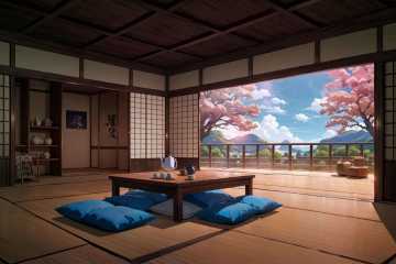 (masterpiece:1.2),best quality,blue archive background,no humans, scenery, tree, table, tatami, cushion, sky, pillow, indoors, lamp, cup, sliding doors, day, east asian architecture, wooden floor, architecture, bowl, vase, cloud, zabuton, window, shelf, box, sunlight, teapot, basket<lora:blue archive background-000018:0.8>,