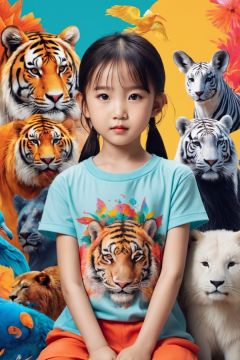 Social art, colorful backgrounds, splashing colors. A 6-year-old Chinese girl with exquisite facial features, half body portrait, tattoos, surrounded by animals, movie perspective, advertising style, girl, half body photos,