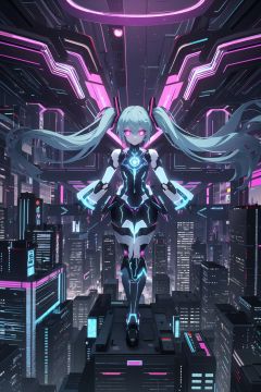 futuristic-style Hatsune Miku,cyberpunk elements,neon lights,holographic accessories,digital environment,advanced technology,robotic aesthetics,anime character,colorful hair,dynamic pose,urban backdrop,glowing eyes,virtual idol,high-tech fashion,immersive atmosphere,vibrant colors,future city skyline,cutting-edge design,stylish outfit,hologram effects,digital art,sci-fi elements,energetic vibe,youth culture,modern anime style,holographic display,illuminated cityscape,night scene,advanced gadgets,cool attitude,, masterpiece, best quality,