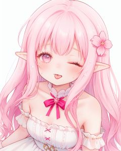 pink hair,eyes closed, pointy ears, long hair, hair flower, Lateral hair,elf,