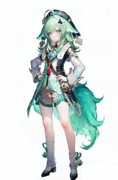 8k, best quality, masterpiece, (ultra-detailed:1.1), (high detailed skin),(full body:1.4), white background, standing, looking at viewer, (solo:1.3), hand on hip,<lora:huohuo-v100-000027:0.85:lbw=OUTALL>, huohuo, 1girl, hat, green hair, long hair, animal ears, tail, (white background, simple background:1.4),<lora:EnvyBetterHands LoCon_beta2 辅助:0.55>, ( good hands, nice hands:0.5),(beautiful_face), ((intricate_detail)), clear face,((finely_detailed)), fine_fabric_emphasis,((glossy)), full_shot,