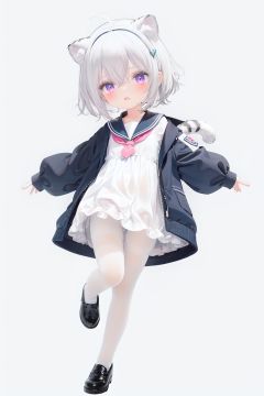 cute,Infant,solo blue shirt,blue sailor coat,loli,full body,white hair,snow leopard ear,white background,pink eyes,laugh,happy,white pantihose,white pantyhose,red armband,
