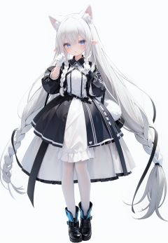 1girl, white_gloves, braid, full_body, gloves, long_hair, official_alternate_costume, pointy_ears, simple_background, solo, standing, very_long_hair, white_background, white hair, blue eyes, paw claw pose, open_mouth