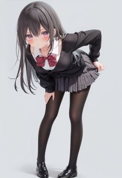 1girl, solo, pantyhose, skirt, long hair, loafers, shoes, simple background, school uniform, brown eyes, plaid, black pantyhose, plaid skirt, looking at viewer, black hair, pantyhose pull, full body, clothes pull, black footwear, pleated skirt, leaning forward, bangs, long sleeves, bent over, cardigan, bow, bowtie, standing, closed mouth, pulled by self, grey background, blush, miniskirt, red bow, sweater, **********