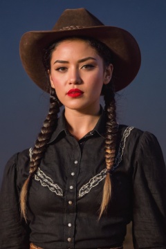 (23-year-old woman), (determined face), (red lips), (black hair braided to the side), (period clothes), (cowboy hat), (blood moon in the background).
