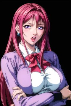 yuanshen,1girl,solo,earrings,jewelry,long hair,lipstick,red hair,crossed arms,makeup,breasts,large breasts,black background,formal,skirt,bow,blue eyes,open mouth,simple background,suit,purple eyes,looking at viewer,