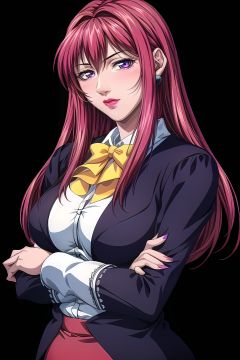 yuanshen,1girl,solo,earrings,jewelry,long hair,lipstick,red hair,crossed arms,makeup,breasts,large breasts,black background,formal,skirt,bow,blue eyes,simple background,suit,purple eyes,looking at viewer,