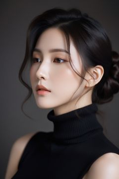 breathtaking long curl hair,profile picture,goddess of dust,a woman in black turtle neck top,featured on cg society,inspired by henri fantin-latour,popular korean makeup,dark pastel colors,black hairs,wearing light,cinematic style photograph,shoulders can be seen,tight bun,wearing beanie, . award-winning, professional, highly detailed