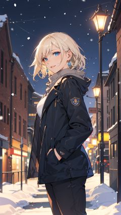 masterpiece,best quality,highres,incredibly absurdres,absurdres,very_high resolution,chromatic aberration,film grain,cinematic,bokeh,caustics,light_particles,lens flare,blurry background,blurry_foreground,depth of field,detailed beautiful scene,scenery,landscape,UHD wallpaper,HDR,8k unity render,octane render,artstation,concept art,global illumination,studio light,volumetric light,dramatic light,blurry,picturesque_scenery,beautiful_optical_effects,1girl,solo,solo_focus,shiny hair,glossy hair,sharp_eyelid,eyeliner,eyelashes,eyeshadow,perfect detailed face,lips,(lipgloss),glossy skin,shiny skin,skinny,toned,mature_female,milf,wide hips,curvy,large_breasts,perky_breasts,pov, from below, dutch_angle, platinum blonde hair, short hair, parted bangs, wavy hair, blue eyes, lateral view, hands in pockets, waiting, from side, blush, cityscape, tan_coat, open coat, night, earrings, pants, ribbed sweater, floating, outdoors, snowing, smile, snow, utility pole, snowflakes, bare tree, winter, street, white_scarf, town, christmas, merry christmas, night_sky, city lights, lamppost, dark,motion_blur,