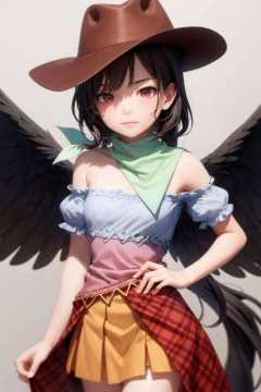 masterpiece, best quality, <lora:KurokomaSaki:1>,kurokoma saki, 1girl,cowboy hat,black hair,long hair,ponytail,red eyes,bandana, white scarf,multicolored clothes,bare shoulder,short sleeves,blue shirt,wings,multicolored dress, brown skirt,plaid skirt,overskirt,horse tail,