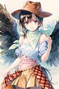 masterpiece, best quality, <lora:style19:1>,watercolor \(medium\), traditional media, <lora:KurokomaSaki:1>,kurokoma saki, 1girl,cowboy hat,black hair,long hair,ponytail,red eyes,bandana, white scarf,multicolored clothes,bare shoulder,short sleeves,blue shirt,wings,multicolored dress, brown skirt,plaid skirt,overskirt,horse tail,