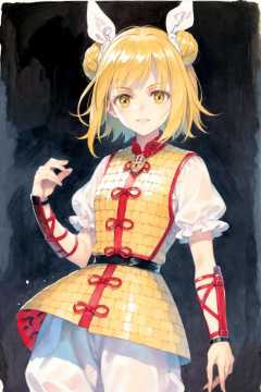 masterpiece, best quality, <lora:JoutouguMayumi:1>, <lora:style19:1>,watercolor \(medium\), traditional media, joutouguu mayumi,1girl,double bun,blonde hair,short hair,hair ribbon,yellow eyes, short sleeves,vambraces, armored dress, white shirt,white pants,