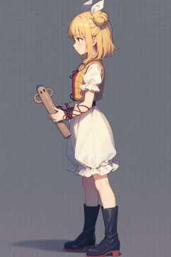 masterpiece, best quality, <lora:JoutouguMayumi:1>, 1girl, joutouguu mayumi, ribbon, white ribbon, haniwa (statue), short sleeves, hair bun, hair ribbon, puffy sleeves, black footwear, blonde hair, puffy short sleeves, boots, double bun, short hair, standing, solo, holding, bangs, full body, yellow eyes, white shirt, shirt, dress, armor, bloomers, profile, underwear, vambraces, grey background, red ribbon, shadow
