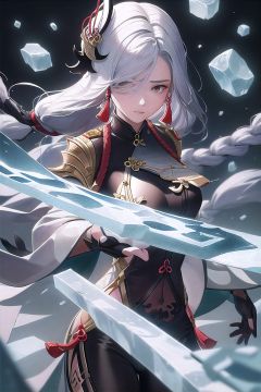 shenhedef, masterpiece, best_quality, (incant:1.3), poor house, gloom, serious, standing, flowing ice scroll, (ice incantation), sunlight, (medium chest:1.2),