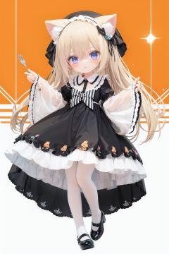 (cinematic lighting), dreamy atmosphere, Ray tracing, (((solo))), (loli:1.5), (child:1.5), (petite:1.5), green eyes, (animal ears), dress, solo, food, blonde hair, open mouth, long hair, pancake, flower, holding, bow, smile, fork, bird, socks, looking at viewer, shoes, striped background, holding fork, bonnet, striped, frills, long sleeves, :d, yellow dress, bangs, eyebrows visible through hair, blush, green nails, hair bow, nail polish, diagonal stripes, chick, sparkle, frilled dress, orange bow, fruit, full body, :3, hair between eyes, green bow, puffy sleeves, heart, lemon, orange footwear, animal ear fluff, white bow, cat ears, bobby socks, orange headwear, see-through sleeves, blue background, striped bow, hair ornament, white legwear, mary janes