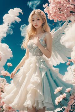 An illustration of a beautiful girl in a manga style, inspired by the works of Hayao Miyazaki. The girl has flowing blonde hair and captivating eyes, radiating a sense of innocence and charm. The art style is vibrant and colorful, with a mix of pastel tones and vibrant hues. The lighting is soft and natural, highlighting her delicate features. The atmosphere is whimsical and enchanting, transporting the viewer to a dreamlike world.,crystal_dress , crystal , wings ,colorful, flowing skirts,(smoke),Giant flowers,