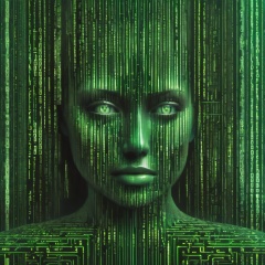 everything is made of vertical matrix code. A detailed close up of a Matrix code woman's face.