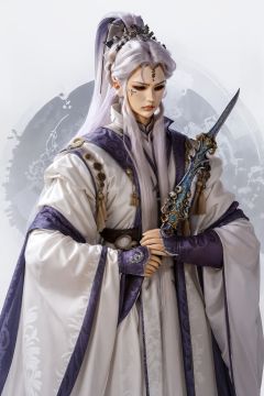 masterpiece,best quality,pili\(muou\),puppet show,1boy,1girl,arm guards,armor,artist name,beads,black eyes,blue background,blue eyes,cape,chinese clothes,circlet,closed eyes,closed mouth,cowboy shot,dark background,facial mark,facing viewer,forehead mark,gloves,grey hair,hair bun,hair ornament,hair stick,hanfu,hat,headpiece,holding,holding sword,holding weapon,jewelry,lips,lipstick,long hair,long sleeves,looking at viewer,looking away,looking to the side,makeup,male focus,manly,ponytail,purple hair,realistic,ring,robe,serious,sheath,sidelocks,simple background,single hair bun,sleeves past wrists,solo,standing,sword,tassel,tiara,upper body,very long hair,weapon,white hair,white robe,wide sleeves,<lora:pilimuouxi-000008:0.5>,